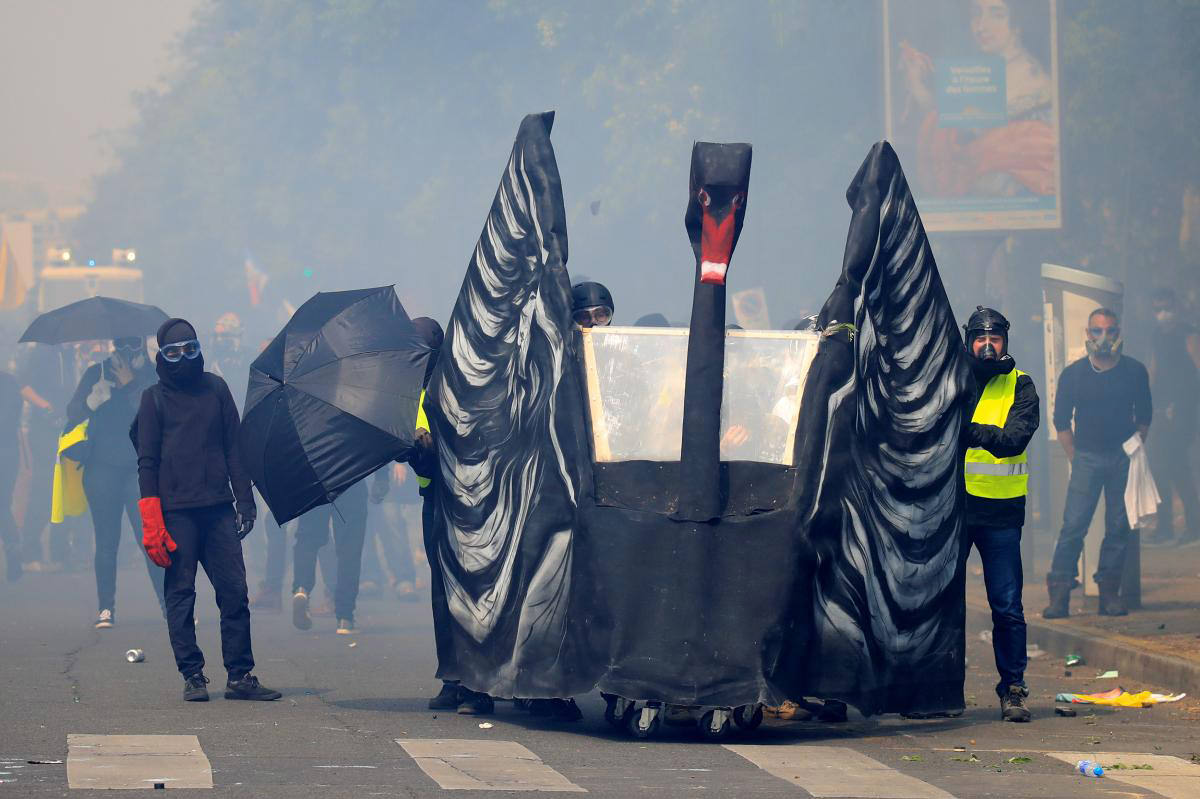 Demonstrators employ a parade float to protect demonstrators from police violence in Paris on May Day 2019.