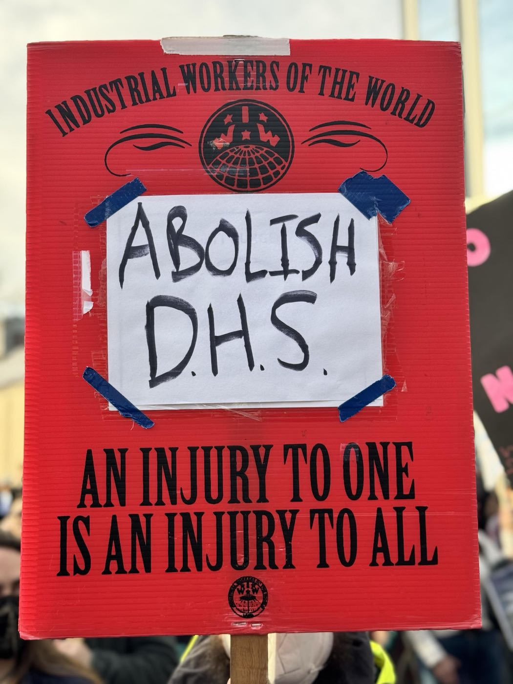 A sign displayed during protests against the Portland ICE facility at the end of January 2026. Photograph by Alissa Azar.