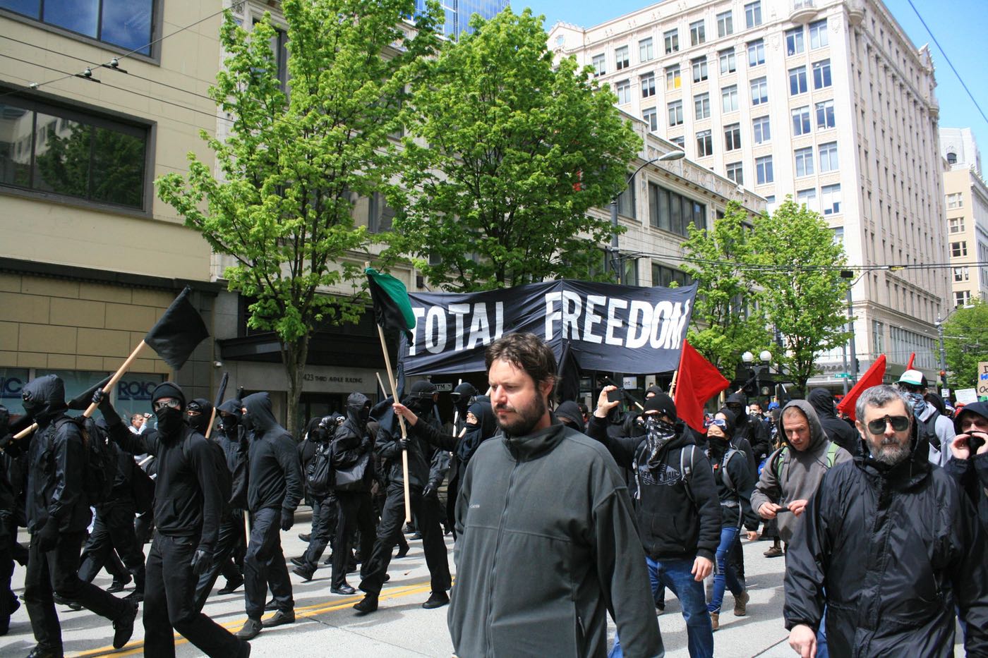 Anarchists march through downtown Seattle on May Day 2012, en route to smash up the same Niketown outlet famously damaged by demonstrators against the 1999 World Trade Organization summit.